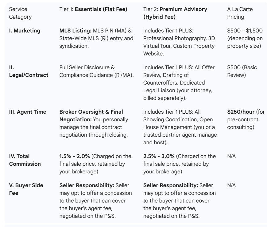 We specialize in unbundling the real estate transaction. After 34 years as a licensed Brokerage in Rhode Island and Massachusetts, We have shifted to a fee-for-service advisory model to eliminate commission conflict. We work with sophisticated sellers and buyers who demand transparent pricing and expert compliance management (e.g., new MA Home Inspection laws, RI Written Buyer Agreements). I am not commission-driven; I am a dedicated fiduciary advisor."