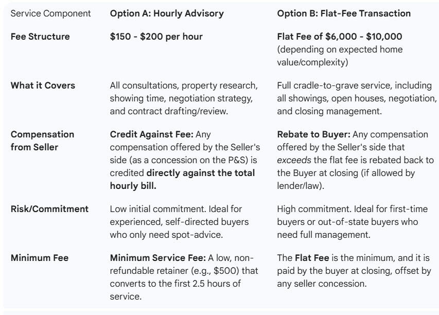 The new market requires a transparent relationship. As an experienced dual-state broker, I charge for my time and expertise, just like your attorney or financial advisor. You decide which fee structure gives you the most confidence."Addressing the "Cost": "Under Option B (Flat-Fee), my fee is $8,000. When we find your perfect home, we will ask the seller for a concession to cover this fee. If the seller agrees to, say, $10,000, you pay my $8,000 fee, and you get a $2,000 credit back at closing, all while being represented by a broker with 34 years of experience."